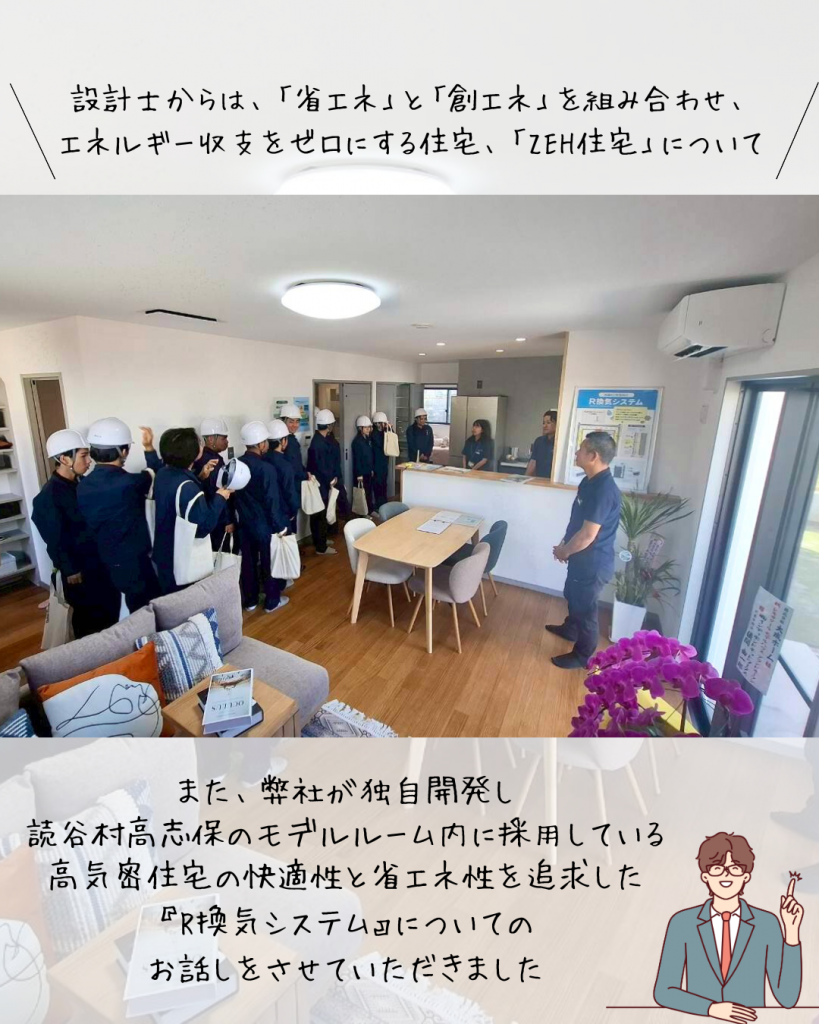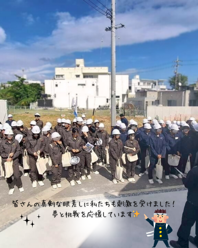 そして見学の最後には、若手社員の翁長(設計部・入社2年目)と仲村(設計部・入社1年目)から、仕事のやりがいや、この道を選んだ理由などを熱く語り、生徒さんからは次々と質問が寄せられました✨先輩からのリアルな話は、きっと将来の進路を考えるヒントになったはず🎓