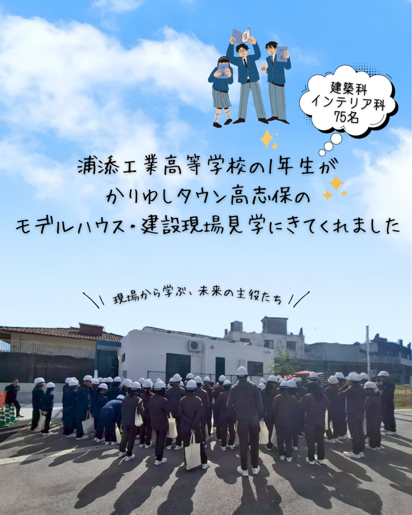 先日、沖縄県立浦添工業高等学校の建築科・インテリア科の1年生75名と先生方で弊社のかりゆしタウン高志保のモデルハウス・建設現場の見学会を行いました🏠✨
